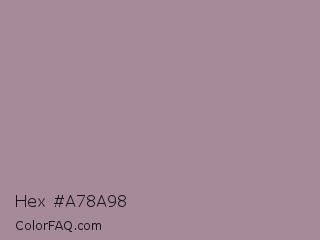 Hex #a78a98 Color is a normal rose color and the nearest color is Bouquet #ae809e. Hex code #a78a98 and RGB value is rgb(167,138,152). In RGB color space, this color is composed of 65% red, 54% green, 60% blue, In CMYK color space, this color is composed of 0% cyan, 17% magenta, 9% yellow , 35% black , In HSL color space, this color has a hue angle of 331° , 14% saturation and 60% lightness.