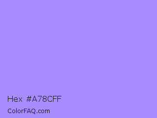 Hex #a78cff Color is a light indigo color and the nearest color is Dull Lavender #a899e6. Hex code #a78cff and RGB value is rgb(167,140,255). In RGB color space, this color is composed of 65% red, 55% green, 100% blue, In CMYK color space, this color is composed of 35% cyan, 45% magenta, 0% yellow , 0% black , In HSL color space, this color has a hue angle of 254° , 100% saturation and 77% lightness.