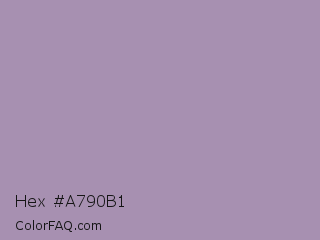 Hex #a790b1 Color is a light purple color and the nearest color is Glossy Grape #ab92b3. Hex code #a790b1 and RGB value is rgb(167,144,177). In RGB color space, this color is composed of 65% red, 56% green, 69% blue, In CMYK color space, this color is composed of 6% cyan, 19% magenta, 0% yellow , 31% black , In HSL color space, this color has a hue angle of 282° , 17% saturation and 63% lightness.