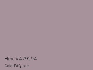 Hex #a7919a Color is a light rose color and the nearest color is Dusty Gray #a8989b. Hex code #a7919a and RGB value is rgb(167,145,154). In RGB color space, this color is composed of 65% red, 57% green, 60% blue, In CMYK color space, this color is composed of 0% cyan, 13% magenta, 8% yellow , 35% black , In HSL color space, this color has a hue angle of 335° , 11% saturation and 61% lightness.