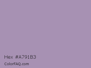 Hex #a791b3 Color is a light purple color and the nearest color is Glossy Grape #ab92b3. Hex code #a791b3 and RGB value is rgb(167,145,179). In RGB color space, this color is composed of 65% red, 57% green, 70% blue, In CMYK color space, this color is composed of 7% cyan, 19% magenta, 0% yellow , 30% black , In HSL color space, this color has a hue angle of 279° , 18% saturation and 64% lightness.