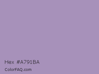 Hex #a791ba Color is a light purple color and the nearest color is Glossy Grape #ab92b3. Hex code #a791ba and RGB value is rgb(167,145,186). In RGB color space, this color is composed of 65% red, 57% green, 73% blue, In CMYK color space, this color is composed of 10% cyan, 22% magenta, 0% yellow , 27% black , In HSL color space, this color has a hue angle of 272° , 23% saturation and 65% lightness.