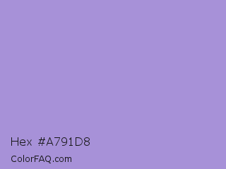 Hex #a791d8 Color is a light indigo color and the nearest color is East Side #ac91ce. Hex code #a791d8 and RGB value is rgb(167,145,216). In RGB color space, this color is composed of 65% red, 57% green, 85% blue, In CMYK color space, this color is composed of 23% cyan, 33% magenta, 0% yellow , 15% black , In HSL color space, this color has a hue angle of 259° , 48% saturation and 71% lightness.