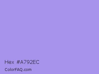 Hex #a792ec Color is a light indigo color and the nearest color is Dull Lavender #a899e6. Hex code #a792ec and RGB value is rgb(167,146,236). In RGB color space, this color is composed of 65% red, 57% green, 93% blue, In CMYK color space, this color is composed of 29% cyan, 38% magenta, 0% yellow , 7% black , In HSL color space, this color has a hue angle of 254° , 70% saturation and 75% lightness.