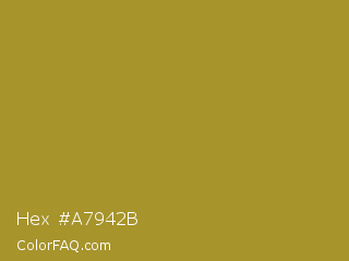 Hex #a7942b Color is a normal yellow color and the nearest color is Alpine #af8f2c. Hex code #a7942b and RGB value is rgb(167,148,43). In RGB color space, this color is composed of 65% red, 58% green, 17% blue, In CMYK color space, this color is composed of 0% cyan, 11% magenta, 74% yellow , 35% black , In HSL color space, this color has a hue angle of 51° , 59% saturation and 41% lightness.