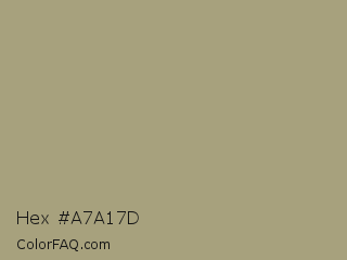 Hex #a7a17d Color is a normal yellow color and the nearest color is Hillary #aca586. Hex code #a7a17d and RGB value is rgb(167,161,125). In RGB color space, this color is composed of 65% red, 63% green, 49% blue, In CMYK color space, this color is composed of 0% cyan, 4% magenta, 25% yellow , 35% black , In HSL color space, this color has a hue angle of 51° , 19% saturation and 57% lightness.