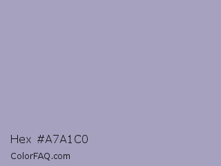 Hex #a7a1c0 Color is a light indigo color and the nearest color is Spun Pearl #aaabb7. Hex code #a7a1c0 and RGB value is rgb(167,161,192). In RGB color space, this color is composed of 65% red, 63% green, 75% blue, In CMYK color space, this color is composed of 13% cyan, 16% magenta, 0% yellow , 25% black , In HSL color space, this color has a hue angle of 252° , 20% saturation and 69% lightness.