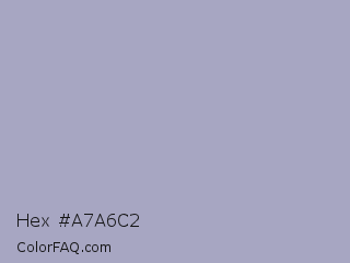 Hex #a7a6c2 Color is a light indigo color and the nearest color is Logan #aaa9cd. Hex code #a7a6c2 and RGB value is rgb(167,166,194). In RGB color space, this color is composed of 65% red, 65% green, 76% blue, In CMYK color space, this color is composed of 14% cyan, 14% magenta, 0% yellow , 24% black , In HSL color space, this color has a hue angle of 242° , 19% saturation and 71% lightness.
