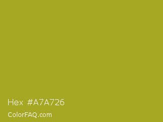 Hex #a7a726 Color is a normal yellow color and the nearest color is Citron #9fa91f. Hex code #a7a726 and RGB value is rgb(167,167,38). In RGB color space, this color is composed of 65% red, 65% green, 15% blue, In CMYK color space, this color is composed of 0% cyan, 0% magenta, 77% yellow , 35% black , In HSL color space, this color has a hue angle of 60° , 63% saturation and 40% lightness.