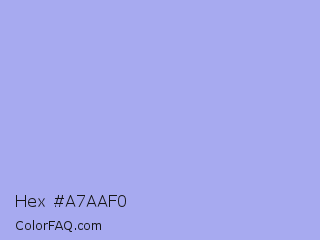 Hex #a7aaf0 Color is a light blue color and the nearest color is Maximum Blue Purple #acace6. Hex code #a7aaf0 and RGB value is rgb(167,170,240). In RGB color space, this color is composed of 65% red, 67% green, 94% blue, In CMYK color space, this color is composed of 30% cyan, 29% magenta, 0% yellow , 6% black , In HSL color space, this color has a hue angle of 238° , 71% saturation and 80% lightness.