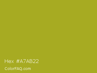 Hex #a7ab22 Color is a normal yellow color and the nearest color is Citron #9fa91f. Hex code #a7ab22 and RGB value is rgb(167,171,34). In RGB color space, this color is composed of 65% red, 67% green, 13% blue, In CMYK color space, this color is composed of 2% cyan, 0% magenta, 80% yellow , 33% black , In HSL color space, this color has a hue angle of 62° , 67% saturation and 40% lightness.
