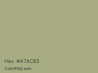 Hex #a7ac83 Color is a normal yellow color and the nearest color is Hillary #aca586. Hex code #a7ac83 and RGB value is rgb(167,172,131). In RGB color space, this color is composed of 65% red, 67% green, 51% blue, In CMYK color space, this color is composed of 3% cyan, 0% magenta, 24% yellow , 33% black , In HSL color space, this color has a hue angle of 67° , 20% saturation and 59% lightness.