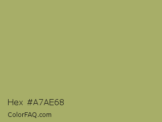 Hex #a7ae68 Color is a normal yellow color and the nearest color is Green Smoke #a4af6e. Hex code #a7ae68 and RGB value is rgb(167,174,104). In RGB color space, this color is composed of 65% red, 68% green, 41% blue, In CMYK color space, this color is composed of 4% cyan, 0% magenta, 40% yellow , 32% black , In HSL color space, this color has a hue angle of 66° , 30% saturation and 55% lightness.