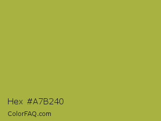 Hex #a7b240 Color is a normal yellow color and the nearest color is Brass #b5a642. Hex code #a7b240 and RGB value is rgb(167,178,64). In RGB color space, this color is composed of 65% red, 70% green, 25% blue, In CMYK color space, this color is composed of 6% cyan, 0% magenta, 64% yellow , 30% black , In HSL color space, this color has a hue angle of 66° , 47% saturation and 47% lightness.
