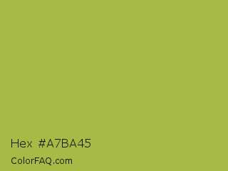 Hex #a7ba45 Color is a normal yellow color and the nearest color is Android Green #a4c639. Hex code #a7ba45 and RGB value is rgb(167,186,69). In RGB color space, this color is composed of 65% red, 73% green, 27% blue, In CMYK color space, this color is composed of 10% cyan, 0% magenta, 63% yellow , 27% black , In HSL color space, this color has a hue angle of 70° , 46% saturation and 50% lightness.