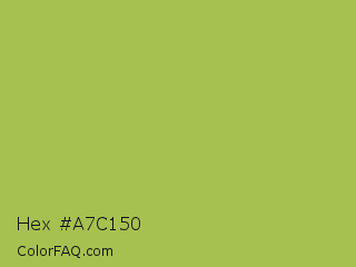 Hex #a7c150 Color is a normal lime color and the nearest color is Middle Green Yellow #acbf60. Hex code #a7c150 and RGB value is rgb(167,193,80). In RGB color space, this color is composed of 65% red, 76% green, 31% blue, In CMYK color space, this color is composed of 13% cyan, 0% magenta, 59% yellow , 24% black , In HSL color space, this color has a hue angle of 74° , 48% saturation and 54% lightness.