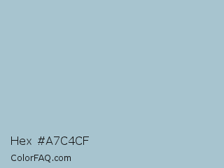 Hex #a7c4cf Color is a light blue color and the nearest color is Pastel Blue #aec6cf. Hex code #a7c4cf and RGB value is rgb(167,196,207). In RGB color space, this color is composed of 65% red, 77% green, 81% blue, In CMYK color space, this color is composed of 19% cyan, 5% magenta, 0% yellow , 19% black , In HSL color space, this color has a hue angle of 197° , 29% saturation and 73% lightness.