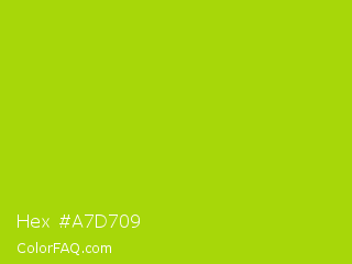 Hex #a7d709 Color is a normal lime color and the nearest color is Vivid Lime Green #a6d608. Hex code #a7d709 and RGB value is rgb(167,215,9). In RGB color space, this color is composed of 65% red, 84% green, 4% blue, In CMYK color space, this color is composed of 22% cyan, 0% magenta, 96% yellow , 16% black , In HSL color space, this color has a hue angle of 74° , 92% saturation and 44% lightness.