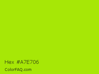 Hex #a7e706 Color is a normal lime color and the nearest color is Inch Worm #b0e313. Hex code #a7e706 and RGB value is rgb(167,231,6). In RGB color space, this color is composed of 65% red, 91% green, 2% blue, In CMYK color space, this color is composed of 28% cyan, 0% magenta, 97% yellow , 9% black , In HSL color space, this color has a hue angle of 77° , 95% saturation and 46% lightness.