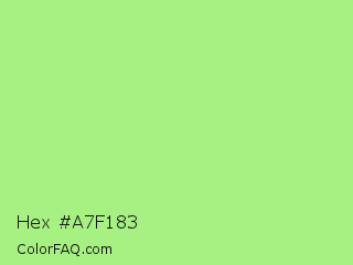 Hex #a7f183 Color is a light green color and the nearest color is Feijoa #9fdd8c. Hex code #a7f183 and RGB value is rgb(167,241,131). In RGB color space, this color is composed of 65% red, 95% green, 51% blue, In CMYK color space, this color is composed of 31% cyan, 0% magenta, 46% yellow , 5% black , In HSL color space, this color has a hue angle of 100° , 80% saturation and 73% lightness.