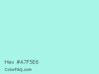 Hex #a7f5e6 Color is a very light cyan color and the nearest color is Ice Cold #b1f4e7. Hex code #a7f5e6 and RGB value is rgb(167,245,230). In RGB color space, this color is composed of 65% red, 96% green, 90% blue, In CMYK color space, this color is composed of 32% cyan, 0% magenta, 6% yellow , 4% black , In HSL color space, this color has a hue angle of 168° , 80% saturation and 81% lightness.