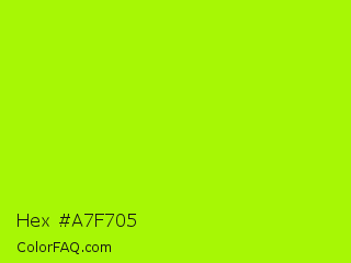 Hex #a7f705 Color is a normal green color and the nearest color is Spring Bud #a7fc00. Hex code #a7f705 and RGB value is rgb(167,247,5). In RGB color space, this color is composed of 65% red, 97% green, 2% blue, In CMYK color space, this color is composed of 32% cyan, 0% magenta, 98% yellow , 3% black , In HSL color space, this color has a hue angle of 80° , 96% saturation and 49% lightness.