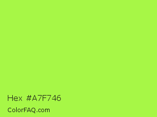 Hex #a7f746 Color is a light green color and the nearest color is French Lime #9efd38. Hex code #a7f746 and RGB value is rgb(167,247,70). In RGB color space, this color is composed of 65% red, 97% green, 27% blue, In CMYK color space, this color is composed of 32% cyan, 0% magenta, 72% yellow , 3% black , In HSL color space, this color has a hue angle of 87° , 92% saturation and 62% lightness.