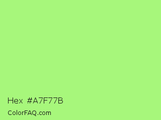 Hex #a7f77b Color is a light green color and the nearest color is Sulu #c1f07c. Hex code #a7f77b and RGB value is rgb(167,247,123). In RGB color space, this color is composed of 65% red, 97% green, 48% blue, In CMYK color space, this color is composed of 32% cyan, 0% magenta, 50% yellow , 3% black , In HSL color space, this color has a hue angle of 99° , 89% saturation and 73% lightness.