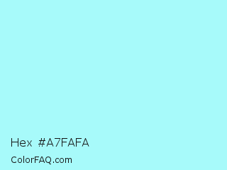 Hex #a7fafa Color is a very light cyan color and the nearest color is Waterspout #a4f4f9. Hex code #a7fafa and RGB value is rgb(167,250,250). In RGB color space, this color is composed of 65% red, 98% green, 98% blue, In CMYK color space, this color is composed of 33% cyan, 0% magenta, 0% yellow , 2% black , In HSL color space, this color has a hue angle of 180° , 89% saturation and 82% lightness.