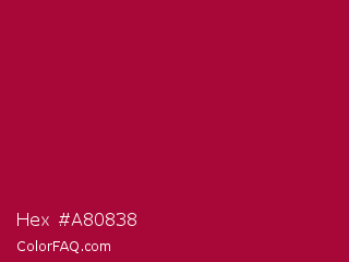 Hex #a80838 Color is a normal rose color and the nearest color is Shiraz #b20931. Hex code #a80838 and RGB value is rgb(168,8,56). In RGB color space, this color is composed of 66% red, 3% green, 22% blue, In CMYK color space, this color is composed of 0% cyan, 95% magenta, 67% yellow , 34% black , In HSL color space, this color has a hue angle of 342° , 91% saturation and 35% lightness.