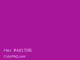 Hex #a8159b Color is a normal magenta color and the nearest color is Violet Eggplant #991199. Hex code #a8159b and RGB value is rgb(168,21,155). In RGB color space, this color is composed of 66% red, 8% green, 61% blue, In CMYK color space, this color is composed of 0% cyan, 88% magenta, 8% yellow , 34% black , In HSL color space, this color has a hue angle of 305° , 78% saturation and 37% lightness.