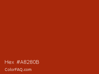 Hex #a8280b Color is a normal red color and the nearest color is Tabasco #a02712. Hex code #a8280b and RGB value is rgb(168,40,11). In RGB color space, this color is composed of 66% red, 16% green, 4% blue, In CMYK color space, this color is composed of 0% cyan, 76% magenta, 93% yellow , 34% black , In HSL color space, this color has a hue angle of 11° , 88% saturation and 35% lightness.