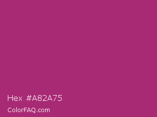 Hex #a82a75 Color is a normal magenta color and the nearest color is Royal Heath #ab3472. Hex code #a82a75 and RGB value is rgb(168,42,117). In RGB color space, this color is composed of 66% red, 16% green, 46% blue, In CMYK color space, this color is composed of 0% cyan, 75% magenta, 30% yellow , 34% black , In HSL color space, this color has a hue angle of 324° , 60% saturation and 41% lightness.