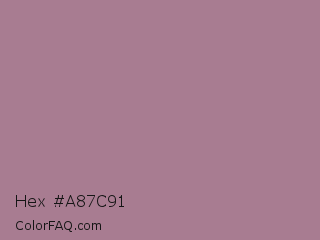 Hex #a87c91 Color is a normal rose color and the nearest color is English Lavender #b48395. Hex code #a87c91 and RGB value is rgb(168,124,145). In RGB color space, this color is composed of 66% red, 49% green, 57% blue, In CMYK color space, this color is composed of 0% cyan, 26% magenta, 14% yellow , 34% black , In HSL color space, this color has a hue angle of 331° , 20% saturation and 57% lightness.