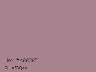 Hex #a8838f Color is a normal rose color and the nearest color is English Lavender #b48395. Hex code #a8838f and RGB value is rgb(168,131,143). In RGB color space, this color is composed of 66% red, 51% green, 56% blue, In CMYK color space, this color is composed of 0% cyan, 22% magenta, 15% yellow , 34% black , In HSL color space, this color has a hue angle of 341° , 18% saturation and 59% lightness.
