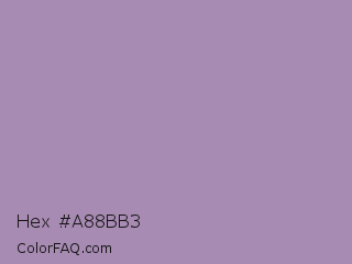 Hex #a88bb3 Color is a light purple color and the nearest color is Glossy Grape #ab92b3. Hex code #a88bb3 and RGB value is rgb(168,139,179). In RGB color space, this color is composed of 66% red, 55% green, 70% blue, In CMYK color space, this color is composed of 6% cyan, 22% magenta, 0% yellow , 30% black , In HSL color space, this color has a hue angle of 284° , 21% saturation and 62% lightness.