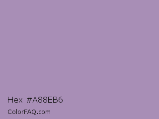 Hex #a88eb6 Color is a light purple color and the nearest color is Glossy Grape #ab92b3. Hex code #a88eb6 and RGB value is rgb(168,142,182). In RGB color space, this color is composed of 66% red, 56% green, 71% blue, In CMYK color space, this color is composed of 8% cyan, 22% magenta, 0% yellow , 29% black , In HSL color space, this color has a hue angle of 279° , 22% saturation and 64% lightness.