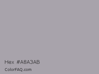 Hex #a8a3ab Color is a light purple color and the nearest color is Shady Lady #aaa5a9. Hex code #a8a3ab and RGB value is rgb(168,163,171). In RGB color space, this color is composed of 66% red, 64% green, 67% blue, In CMYK color space, this color is composed of 2% cyan, 5% magenta, 0% yellow , 33% black , In HSL color space, this color has a hue angle of 278° , 5% saturation and 65% lightness.