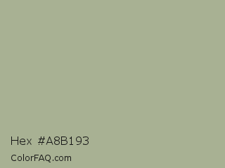 Hex #a8b193 Color is a light lime color and the nearest color is Schist #a9b497. Hex code #a8b193 and RGB value is rgb(168,177,147). In RGB color space, this color is composed of 66% red, 69% green, 58% blue, In CMYK color space, this color is composed of 5% cyan, 0% magenta, 17% yellow , 31% black , In HSL color space, this color has a hue angle of 78° , 16% saturation and 64% lightness.