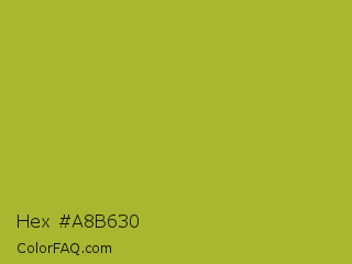 Hex #a8b630 Color is a normal yellow color and the nearest color is Android Green #a4c639. Hex code #a8b630 and RGB value is rgb(168,182,48). In RGB color space, this color is composed of 66% red, 71% green, 19% blue, In CMYK color space, this color is composed of 8% cyan, 0% magenta, 74% yellow , 29% black , In HSL color space, this color has a hue angle of 66° , 58% saturation and 45% lightness.
