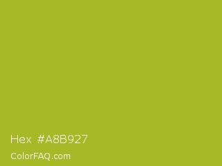Hex #a8b927 Color is a normal yellow color and the nearest color is Acid Green #b0bf1a. Hex code #a8b927 and RGB value is rgb(168,185,39). In RGB color space, this color is composed of 66% red, 73% green, 15% blue, In CMYK color space, this color is composed of 9% cyan, 0% magenta, 79% yellow , 27% black , In HSL color space, this color has a hue angle of 67° , 65% saturation and 44% lightness.