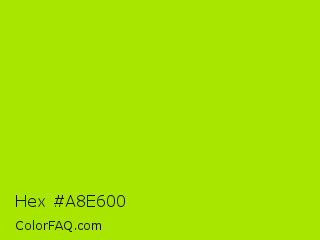 Hex #a8e600 Color is a normal lime color and the nearest color is Vivid Lime Green #a6d608. Hex code #a8e600 and RGB value is rgb(168,230,0). In RGB color space, this color is composed of 66% red, 90% green, 0% blue, In CMYK color space, this color is composed of 27% cyan, 0% magenta, 100% yellow , 10% black , In HSL color space, this color has a hue angle of 76° , 100% saturation and 45% lightness.