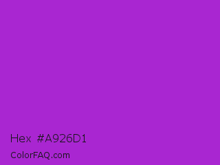 Hex #a926d1 Color is a normal purple color and the nearest color is Dark Orchid #9932cc. Hex code #a926d1 and RGB value is rgb(169,38,209). In RGB color space, this color is composed of 66% red, 15% green, 82% blue, In CMYK color space, this color is composed of 19% cyan, 82% magenta, 0% yellow , 18% black , In HSL color space, this color has a hue angle of 286° , 69% saturation and 48% lightness.