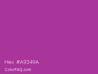 Hex #a9349a Color is a normal magenta color and the nearest color is Fandango #b53389. Hex code #a9349a and RGB value is rgb(169,52,154). In RGB color space, this color is composed of 66% red, 20% green, 60% blue, In CMYK color space, this color is composed of 0% cyan, 69% magenta, 9% yellow , 34% black , In HSL color space, this color has a hue angle of 308° , 53% saturation and 43% lightness.