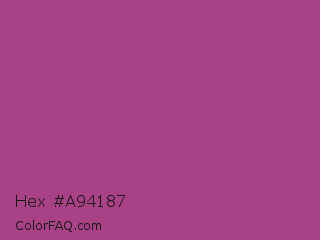 Hex #a94187 Color is a normal magenta color and the nearest color is Mystic Maroon #ad4379. Hex code #a94187 and RGB value is rgb(169,65,135). In RGB color space, this color is composed of 66% red, 25% green, 53% blue, In CMYK color space, this color is composed of 0% cyan, 62% magenta, 20% yellow , 34% black , In HSL color space, this color has a hue angle of 320° , 44% saturation and 46% lightness.