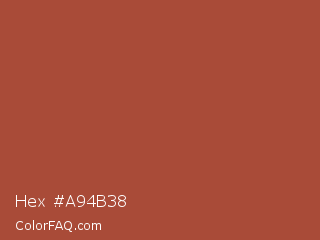 Hex #a94b38 Color is a normal red color and the nearest color is Apple Blossom #af4d43. Hex code #a94b38 and RGB value is rgb(169,75,56). In RGB color space, this color is composed of 66% red, 29% green, 22% blue, In CMYK color space, this color is composed of 0% cyan, 56% magenta, 67% yellow , 34% black , In HSL color space, this color has a hue angle of 10° , 50% saturation and 44% lightness.