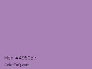 Hex #a980b7 Color is a light purple color and the nearest color is African Violet #b284be. Hex code #a980b7 and RGB value is rgb(169,128,183). In RGB color space, this color is composed of 66% red, 50% green, 72% blue, In CMYK color space, this color is composed of 8% cyan, 30% magenta, 0% yellow , 28% black , In HSL color space, this color has a hue angle of 285° , 28% saturation and 61% lightness.