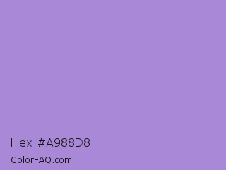 Hex #a988d8 Color is a light violet color and the nearest color is East Side #ac91ce. Hex code #a988d8 and RGB value is rgb(169,136,216). In RGB color space, this color is composed of 66% red, 53% green, 85% blue, In CMYK color space, this color is composed of 22% cyan, 37% magenta, 0% yellow , 15% black , In HSL color space, this color has a hue angle of 265° , 51% saturation and 69% lightness.