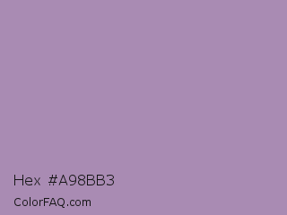 Hex #a98bb3 Color is a light purple color and the nearest color is Glossy Grape #ab92b3. Hex code #a98bb3 and RGB value is rgb(169,139,179). In RGB color space, this color is composed of 66% red, 55% green, 70% blue, In CMYK color space, this color is composed of 6% cyan, 22% magenta, 0% yellow , 30% black , In HSL color space, this color has a hue angle of 285° , 21% saturation and 62% lightness.
