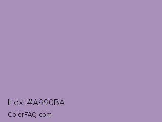Hex #a990ba Color is a light purple color and the nearest color is Glossy Grape #ab92b3. Hex code #a990ba and RGB value is rgb(169,144,186). In RGB color space, this color is composed of 66% red, 56% green, 73% blue, In CMYK color space, this color is composed of 9% cyan, 23% magenta, 0% yellow , 27% black , In HSL color space, this color has a hue angle of 276° , 23% saturation and 65% lightness.